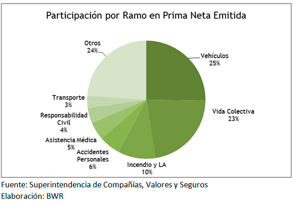 El mercado se encuentra moderadamente diversificado, ya que la principal aseguradora mantiene un 15.1% de participación, y las 10 principales empresas concentran el 70.4% del mercado. En 2017 dejan su actividad las aseguradoras Long Life y Balboa, por liquidación, y seguros Rocafuerte, por fusión por absorción con Seguros Sucre. Adicionalmente, en enero 2018 se liquida TOPSEG y Equivida adquiere a la aseguradora Colvida, con la intención de fusionarla.
