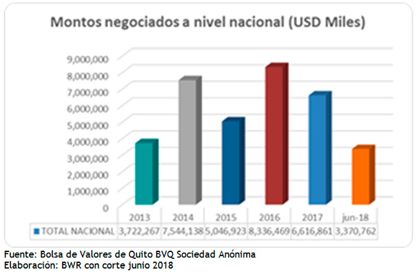 Los montos nacionales negociados han mostrado volatilidades durante los últimos cinco años. En el 2013 la suma se situó en USD 3,722MM, y en el 2014 existió un incremento del 103% (USD 7,544MM), debido principalmente a tres operaciones puntuales de renta variable: la venta de Produbanco, Tonicorp y Lafarge. Por su parte, en el 2015 el monto negociado se reduce a USD 5,046MM, mientras que en el 2016 se observa una recuperación del 65% con un total negociado de USD 8,336MM que se debe principalmente a un aumento de los títulos de renta fija tranzados en el mercado. A 2017 se muestra nuevamente una reducción en los montos negociados correspondientes a menores transacciones tanto en renta fija (-20%) como en renta variable (-56%), alcanzando una suma de USD 6,617MM. Hasta junio-2018 el monto total negociado fue de USD 3,370MM.