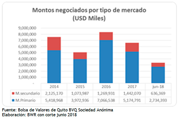 El mercado de valores ecuatoriano muestra otra característica que es la de tener una proporción pequeña de negociaciones en el mercado secundario, en comparación al primario. Esto se traduce en que los activos financieros se tranzan en el mismo momento de su emisión y colocación. El hecho de disponer un mercado secundario no desarrollado es un reflejo de la tendencia de los partícipes del mercado de mantener las inversiones hasta su vencimiento. Con esto, puede existir especulación y variaciones significativas de los precios de los activos financieros en las negociaciones en el mercado secundario frente a su valoración. Adicionalmente, el mercado secundario lograría aumentar su desarrollo con una participación más activa de actores fundamentales como son los fondos previsionales. En caso de países vecinos, la participación de este tipo de fondos representa gran parte de las negociaciones bursátiles.