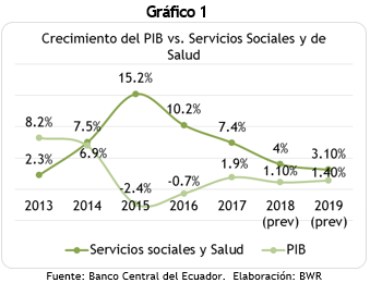 De acuerdo con las previsiones macroeconómicas del Banco Central del Ecuador, la enseñanza y los servicios sociales y de salud crecerían en un 4% para el año 2020 y en un 3.1% para el año 2019. Así, el monto de este rubro en 2019 ascenderá a USD 10,543.70 MM, es decir, 9.25% del PIB [7].