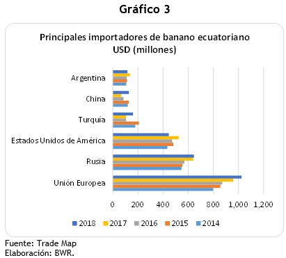 Del total de exportaciones a nivel mundial de este producto en 2018 (USD 13,679MM), el Ecuador exportó USD 3,210MM, es decir el 23.5%. Los principales países competidores son Filipinas, Guatemala, Costa Rica, Bélgica y Colombia. Actualmente existen un total de 234 compañías exportadoras de banano. La Unión Europea capta el 31.8% de la fruta ecuatoriana, seguida de Rusia (20.1%) y Estados Unidos (13.9%).